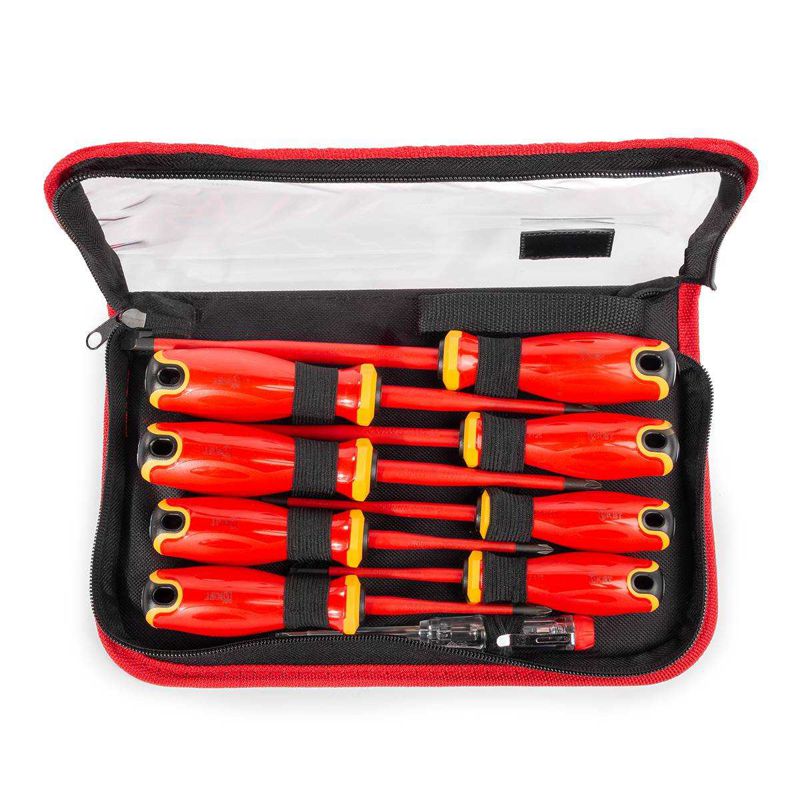 • Состав набора: • Отвертка диэлектрическая шлиц 2.5х75 • Отвертка диэлектрическая шлиц 4.0х100 • Отвертка диэлектрическая шлиц 5.5х125 • Отвертка диэлектрическая шлиц 6.5х150 • Отвертка диэлектрическая PH1х80 • Отвертка диэлектрическая PH2х100 • Отвертка диэлектрическая PZ1x80 • Отвертка диэлектрическая PZ2x100 • Отвертка индикаторная • Для работ под напряжением до 1000 В • Утопленная в лезвие отвертки изоляция делает возможным монтаж винтов с глубокой посадкой • Материал стержня: сталь S2 • Намагниченные вороненные наконечники • Материал изоляции стержня: полипропилен • Маркировка на торце рукояток с обозначением типа профиля • Трехкомпонентная эргономичная рукоятка с мягкими вставками из термопластрезины • Специальная форма рукоятки с защитой от скатывания и отверстием для подвешивания • Упаковка: кофр на молнии с прозрачной крышкой • Вес набора: 704 г