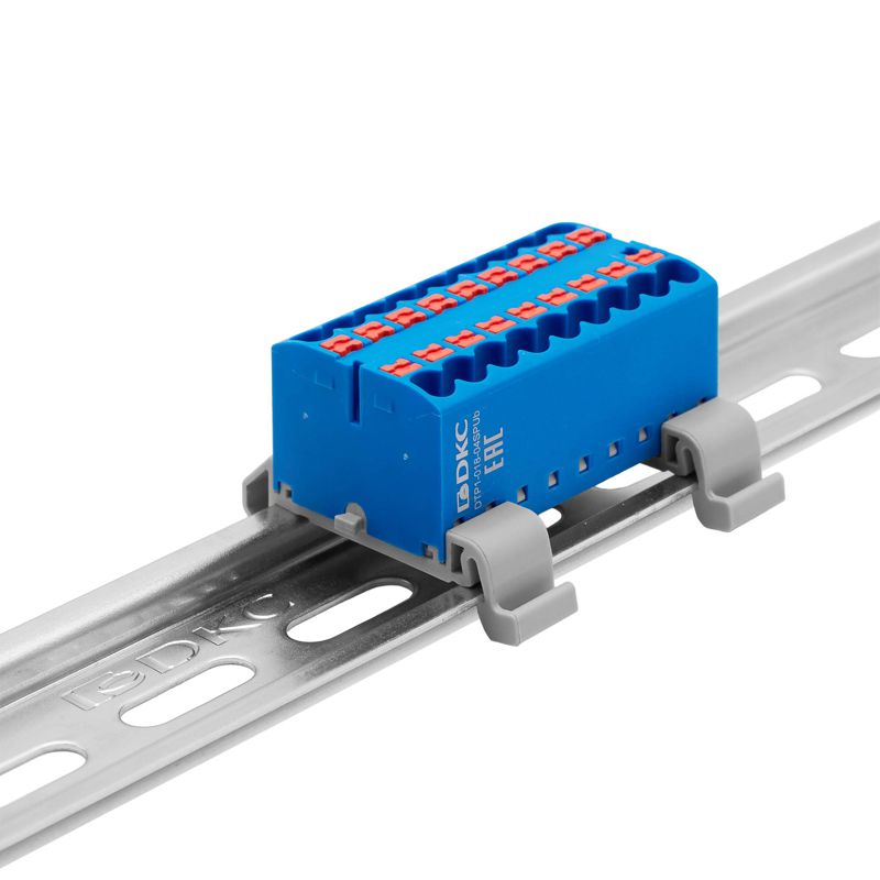 Главная/ Каталог / Колодки клеммные / Проходная клеммная колодка / Блок распределительный с горизонт. адаптером на рейку шир. 35мм зажим push-in 18 точек подключения 2.5кв.мм син. DKC DTP1-018-04SPUB-H