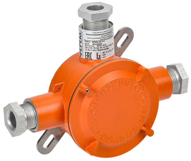 Взрывозащищенные распределительные коробки ВРК предназначены для защиты соединений и разветвлений гибких кабелей в электрических цепях, на объектах в различных отраслях промышленности с высоким риском взрыва и пожара, в зонах опасных по воспламенению горючих газовоздушных смесей или пыли. Коробки поставляются с кабельными вводами и комплектами для кабелей диаметром от 6,0 до 16 мм. Маркировка взрывозащиты по газу: 1Ex Db IIC T6 Gb. Маркировка взрывозащиты по пыли: Ex Tb IIIC T75 C Db.