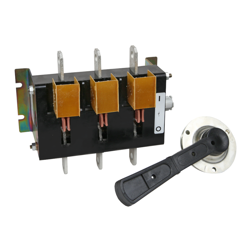 Выключатель-разъединитель 3 полюсный на номинальный ток 400 А, в котором установлена съемная рукоятка.