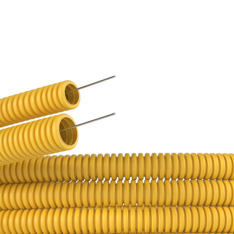 Гибкая гофрированная труба из ПВХ надежно защищает кабель от механических воздействий. Используется для прокладки электрического, компьютерного телефонного кабелей. Труба этого типа прокладывается в стенных штробах, в пустотах фальш-потолков и фальш-стен, в стяжке полов или под фальш-полами. Проволочная протяжка облегчает прокладку кабеля в трубе. Диаметр - 20 мм. Материал – самозатухающий поливинилохлорид (ПВХ). Цвет - желтый. Гофрированные трубы из ПВХ легкой серии могут эксплуатироваться при температуре от – 25 °С до + 60 °С. Длина – 100 метров.