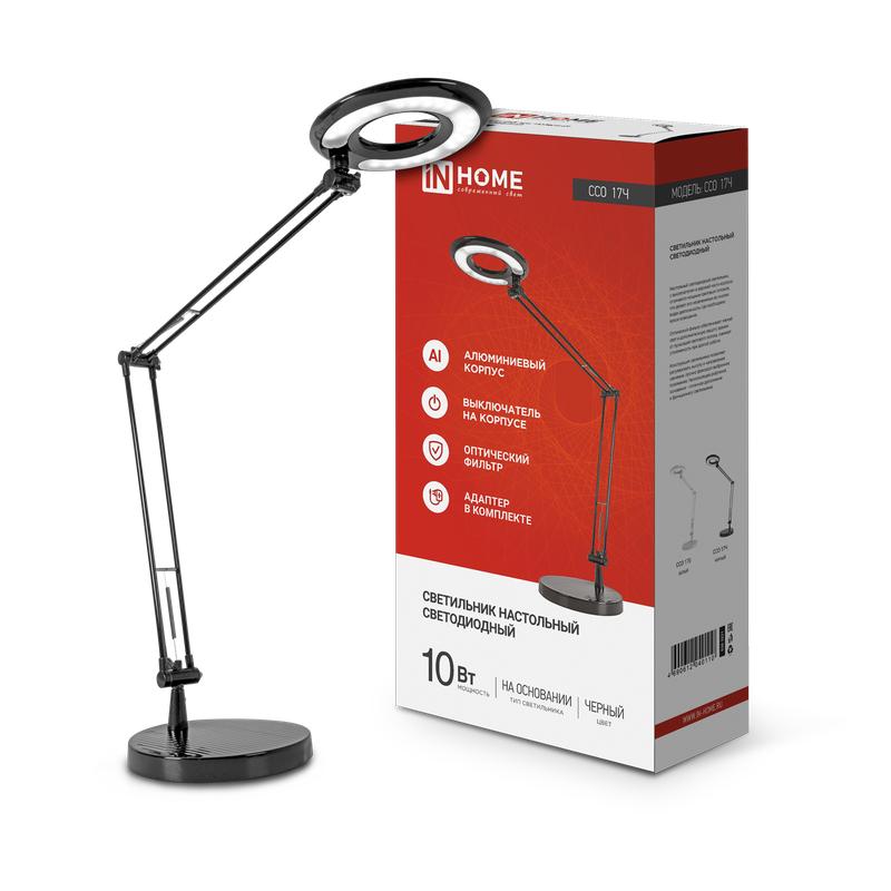 Светильник светодиодный настольный ССО 17Ч 10Вт 6500К 700лм с оптическим фильтром с адаптером черн. IN HOME 4690612040110