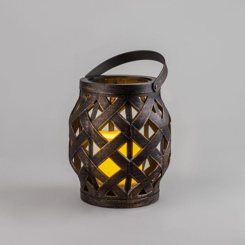Декоративный фонарь со свечкой в плетеном корпусе бронзового цвета — стильное, оригинальное и безопасное светодиодное украшение для интерьера. В центре находится фигурка, выполненная в виде восковой свечи. Диод, излучающий белый свет теплого оттенка, имитирует настоящее пламя, не нагревается и экономно расходует энергию. Фонарь получает питание от 3 батареек типа ААА и не нуждается в розетке. На корпусе предусмотрен выключатель ON/OFF. Изделия на батарейках абсолютно безопасны в использовании.