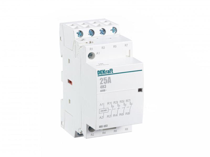 Модульный контактор серии МК-103 Dekraft; ном.ток 25 А (АС-7а); кол-во и исполнение контактов – 4НЗ; напряжение управления 220 В пер.тока; ширина – 2 мод. х 18 мм; установка – на DIN-рейку. Контакторы МК-103 применяются в сетях напряжением до 400 В пер.тока для дистанционного управления небольшими нагрузками, требующими большого количества включений / отключений, например, насосы, системы вентиляции и т.п. Модульные контакторы не требуют дополнительных настроек и специального обслуживания.